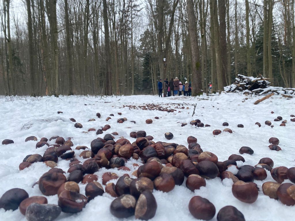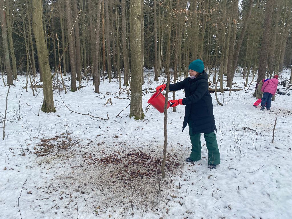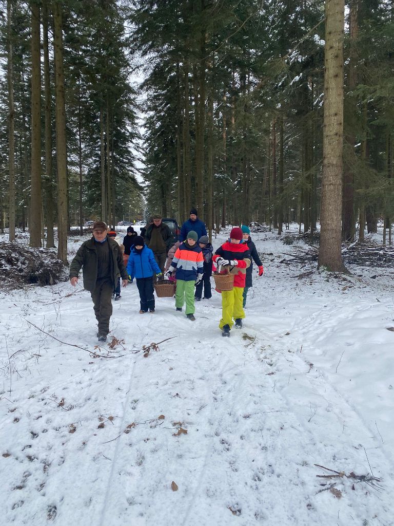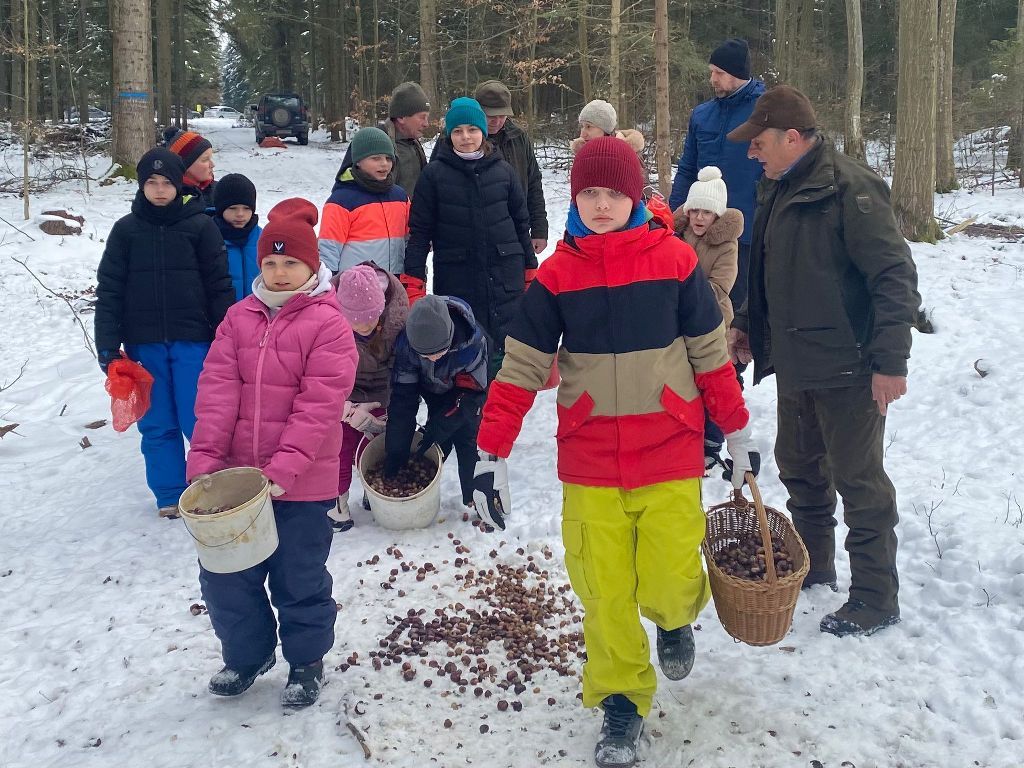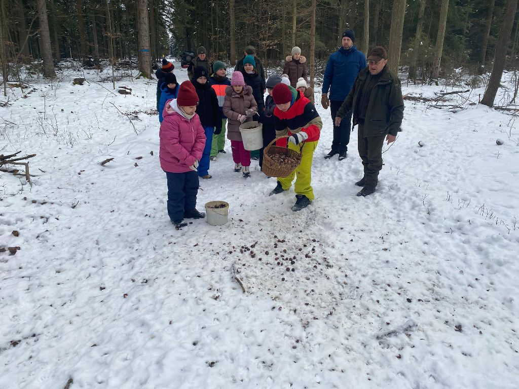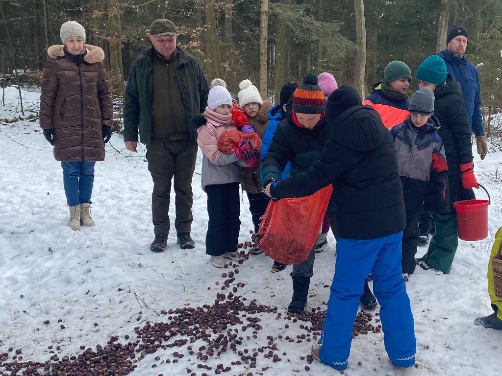 W ramach współpracy Koła Łowieckiego „ Towarzystwo Myśliwskie im. św. Huberta”  w Leżajsku ze szkołami  w dniu 20.02. 2026 grupa dzieci i młodzieży pod okiem rodziców i opiekuna kol. Jana Macha nauczyciela i myśliwego przy pięknej zimowej aurze wyruszyła do lasu, aby wyłożyć karmę dla leśnych zwierząt, którą były kasztany zbierane w corocznej jesiennej akcji przez uczniów Szkoły Podstawowej nr 3 w Leżajsku i przekazane do Koła Łowieckiego.