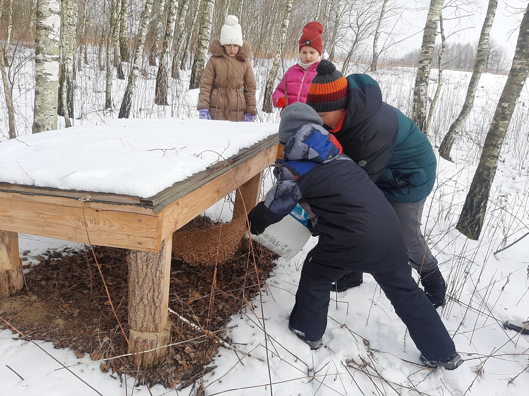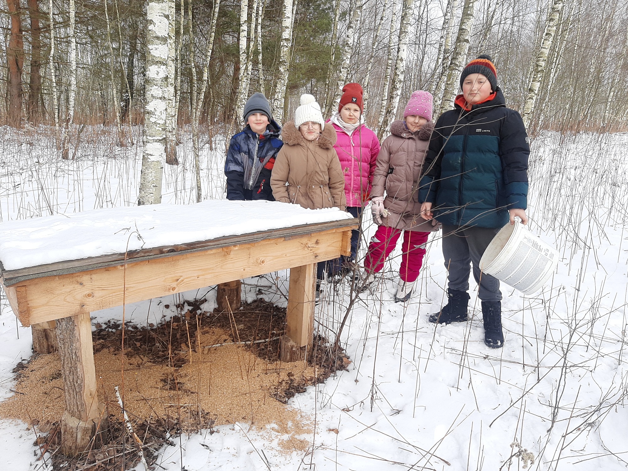 Kilku chłopców z kol. Janem Machem uzupełniło sól w lizawkach przy paśniku.  Po skończonej pracy dzieci zaśpiewały piosenkę „Pojedziemy na łów”, a następnie wszyscy udali się do Ośrodka Hodowli Głuszca w Brzózie Królewskiej, gdzie czekała na nich gorąca herbata oraz ognisko z kiełbaskami, które przygotował myśliwy – podłowczy Koła, kol. Jacek Harasiuk. W sali edukacyjnej ośrodka przez tzw. lustra weneckie uczestnicy obserwowali tokujące głuszce oraz uczyli się rozpoznawać odgłosy lasu na grach edukacyjnych. W drodze powrotnej do domu uzupełniono ziarno w podsypach dla bażantów i kuropatw.