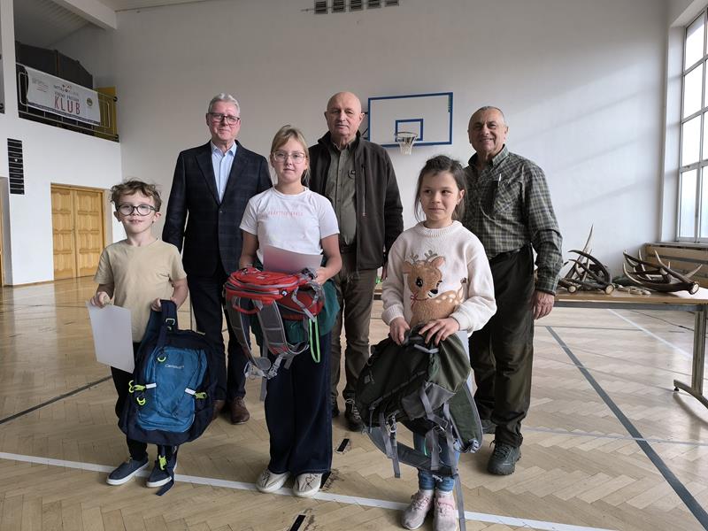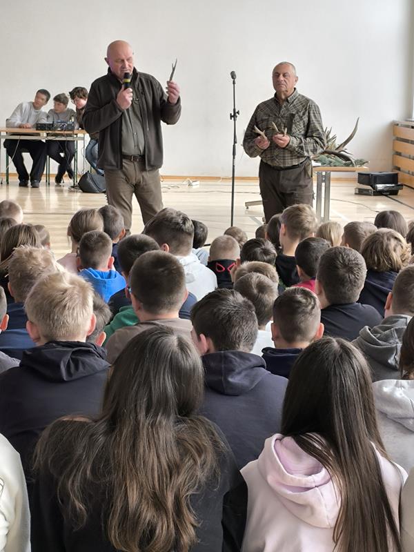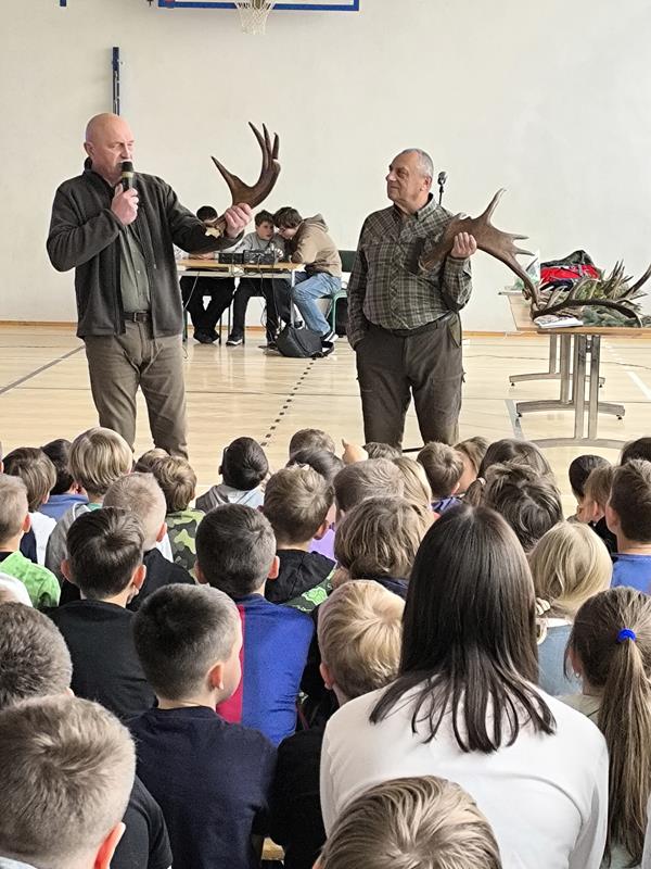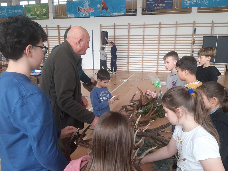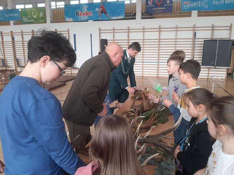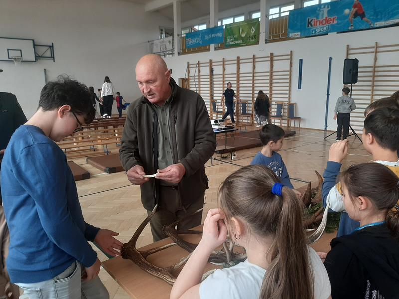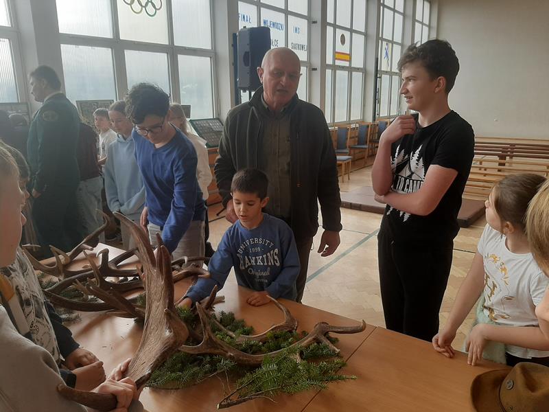 W części edukacyjnej kol. Stanisław Bukowski przedstawił podstawowe informacje o porożach zwierzyny płowej, ich budowie oraz znaczeniu. Była to ciekawa lekcja przyrody zakończona możliwością obejrzenia i potrzymania pięknych zrzutów poroży jelenia, łosia oraz parostków sarny. Młodzież mogła również obejrzeć potężne oręża dzika (fajki i szable).