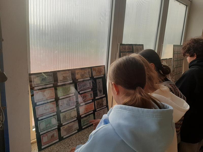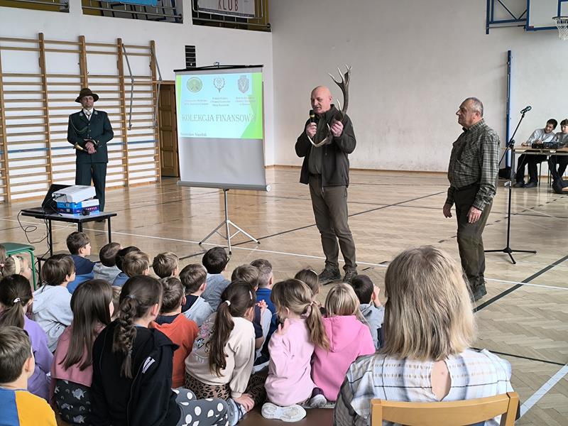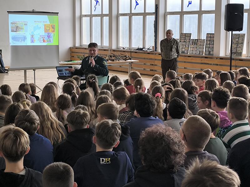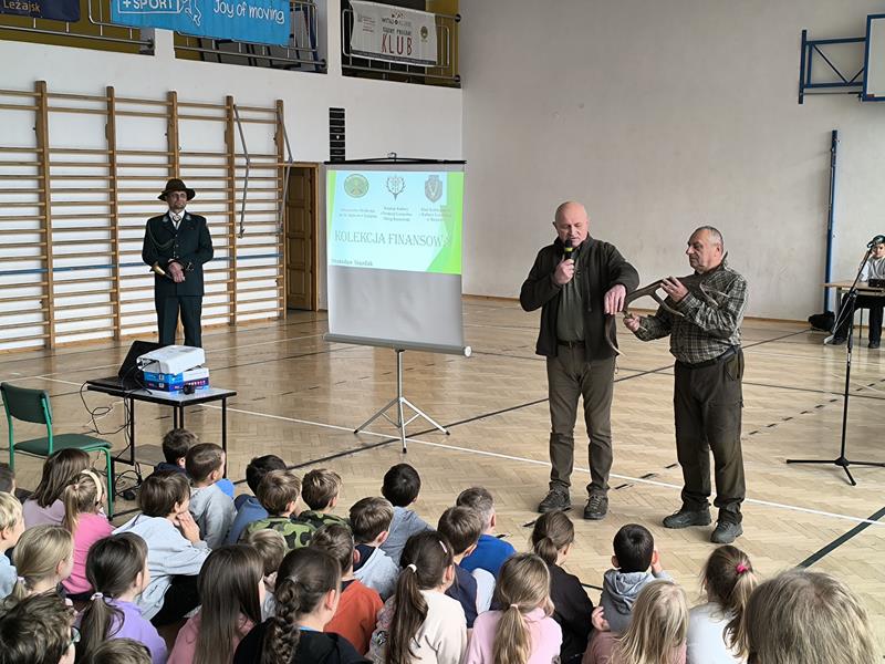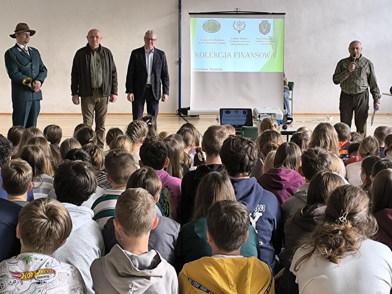 W następnej części kol. Stanisław Siuzdak, przedstawił bardzo ciekawą prezentację swojej pasji kolekcjonerskiej, którą realizuje, zbierając monety i banknoty obiegowe z całego świata. Na tych środkach płatniczych uwieczniono wizerunki zwierząt i ptaków jako nieodłączny element kultury i przetrwania człowieka. Przez awersy zgromadzonych monet przewijają się wilki, muflony i najróżniejsze ptactwo. Na banknotach można zobaczyć wizerunki jeleni, drapieżników, czy też słonki i bażanta. Można zobaczyć jak wygląda Łaskun Palmowy – twórca słynnej kawy Luwak, Algierskie 1000 Dinarów przedstawia rysunek naskalny rogacza z czasów gdy pustynia Sahara tętniła życiem. Uczniowie i nauczyciele mogli poznać tę wspaniałą kolekcję osobiście.